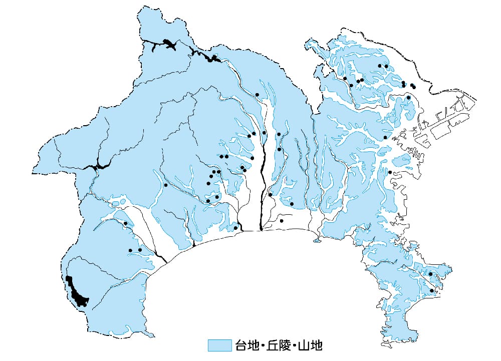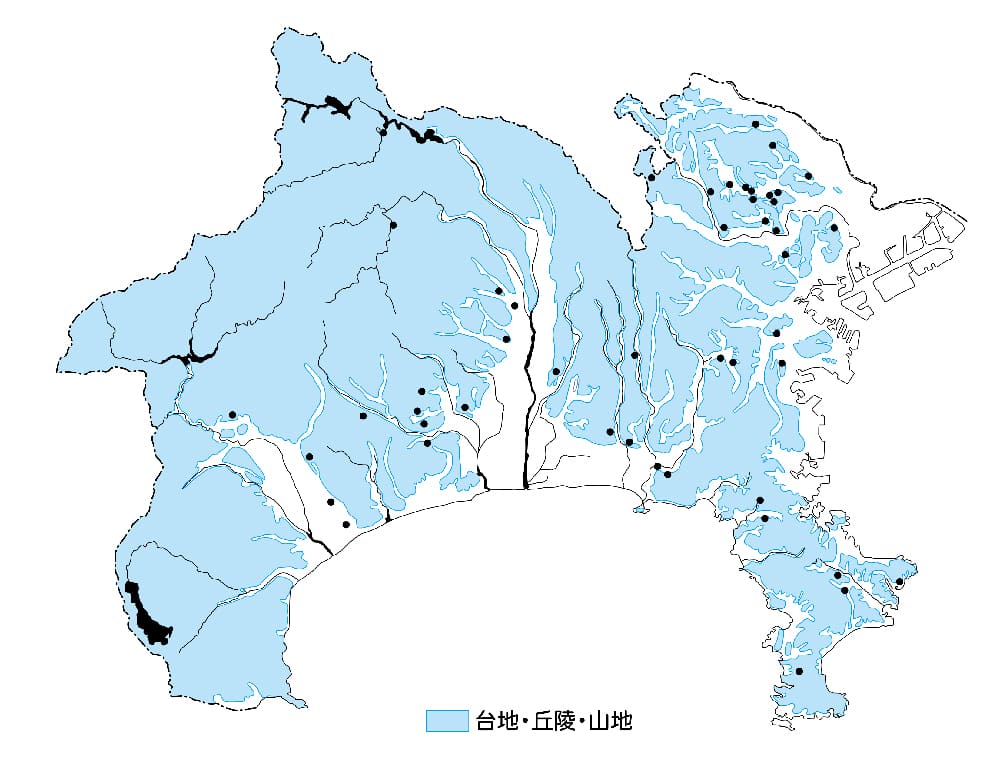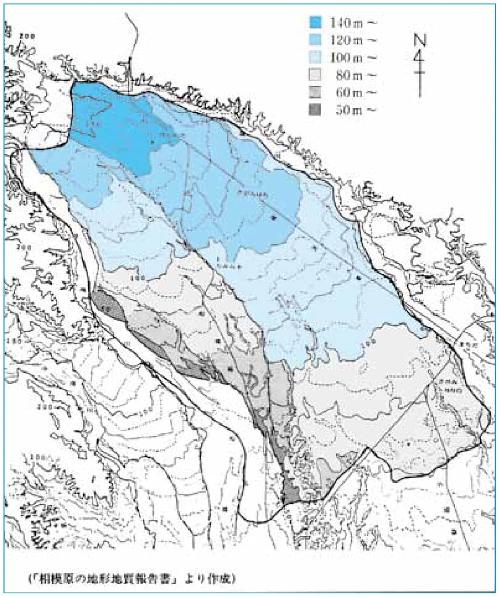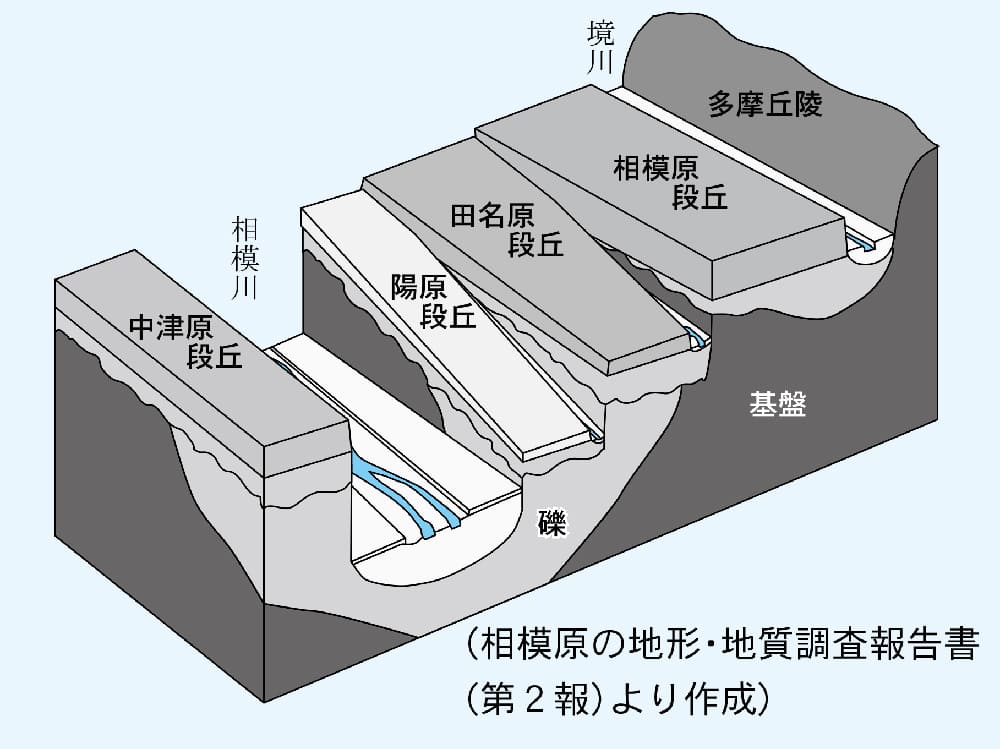 相模原台地は数十万年前以降に形成された台地で,表面は浸食(しんしょく)があまりすすんでいません。台地北端の最高所で海抜約160m,南端の最低所は東部で約70m,西部の低地では約30mです。この台地は相模川の河岸段丘(かがんだんきゅう)で,各段の境は急な崖(がけ)となっています。