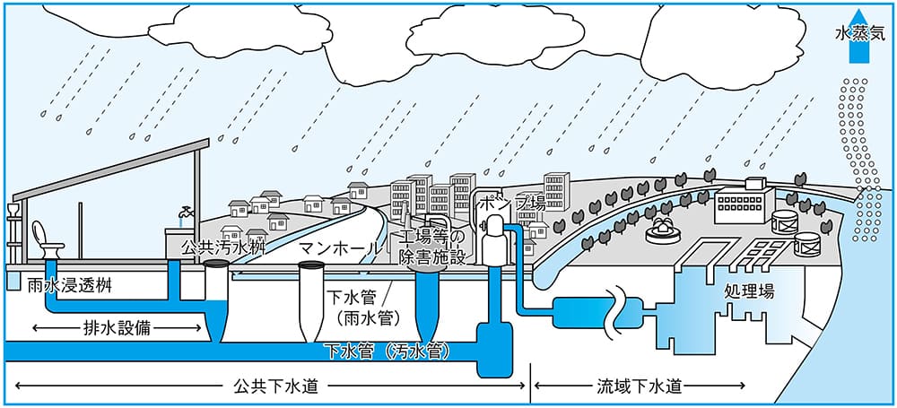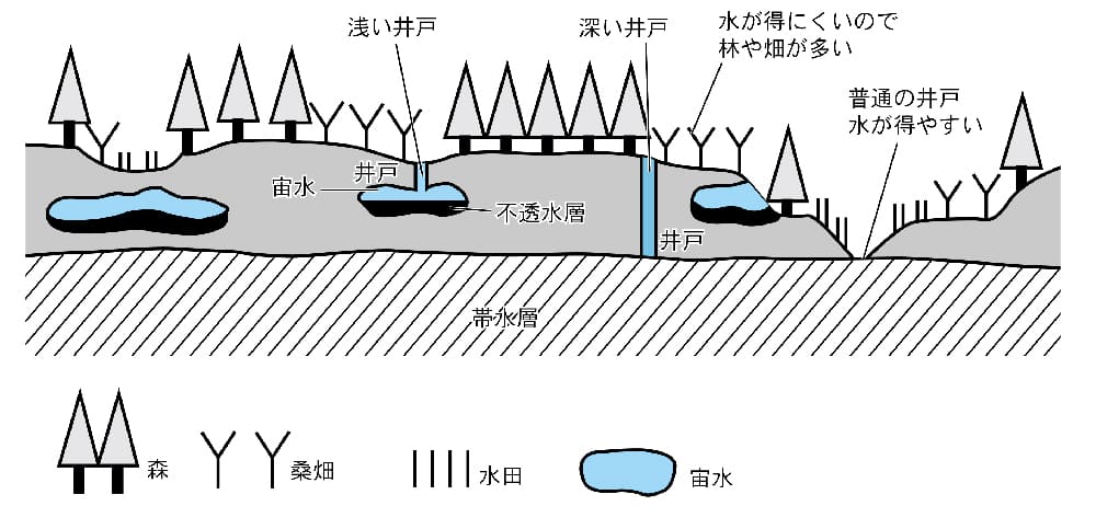 これは水を通す土の層の上に,きれぎれの粘土質など水を通さない層があるため,その部分だけに水がたまり,井戸が浅くてすむのです。その部分を「宙水」といいます。