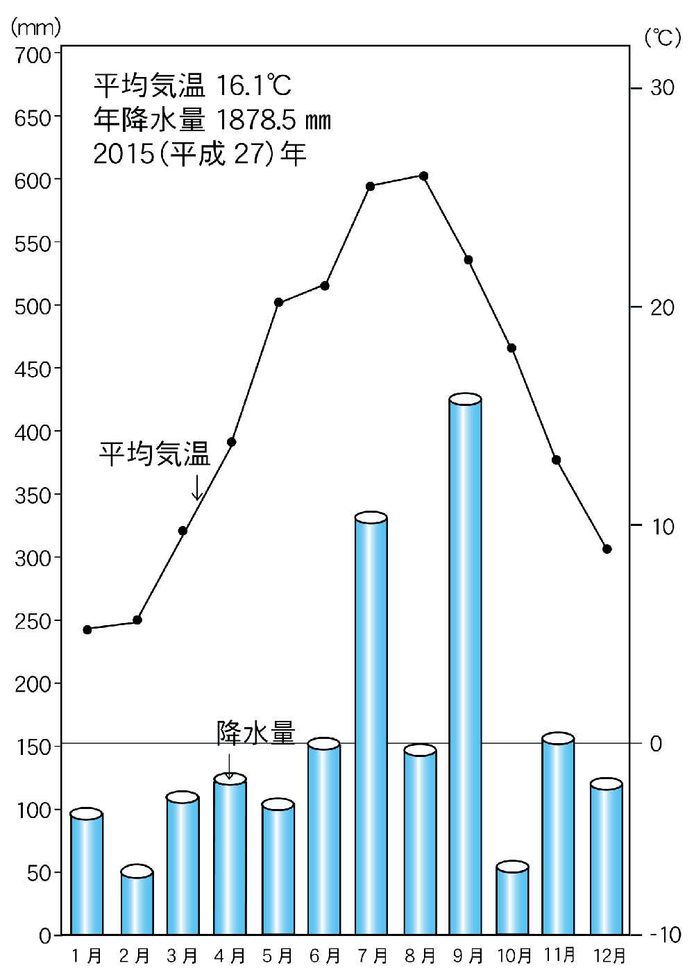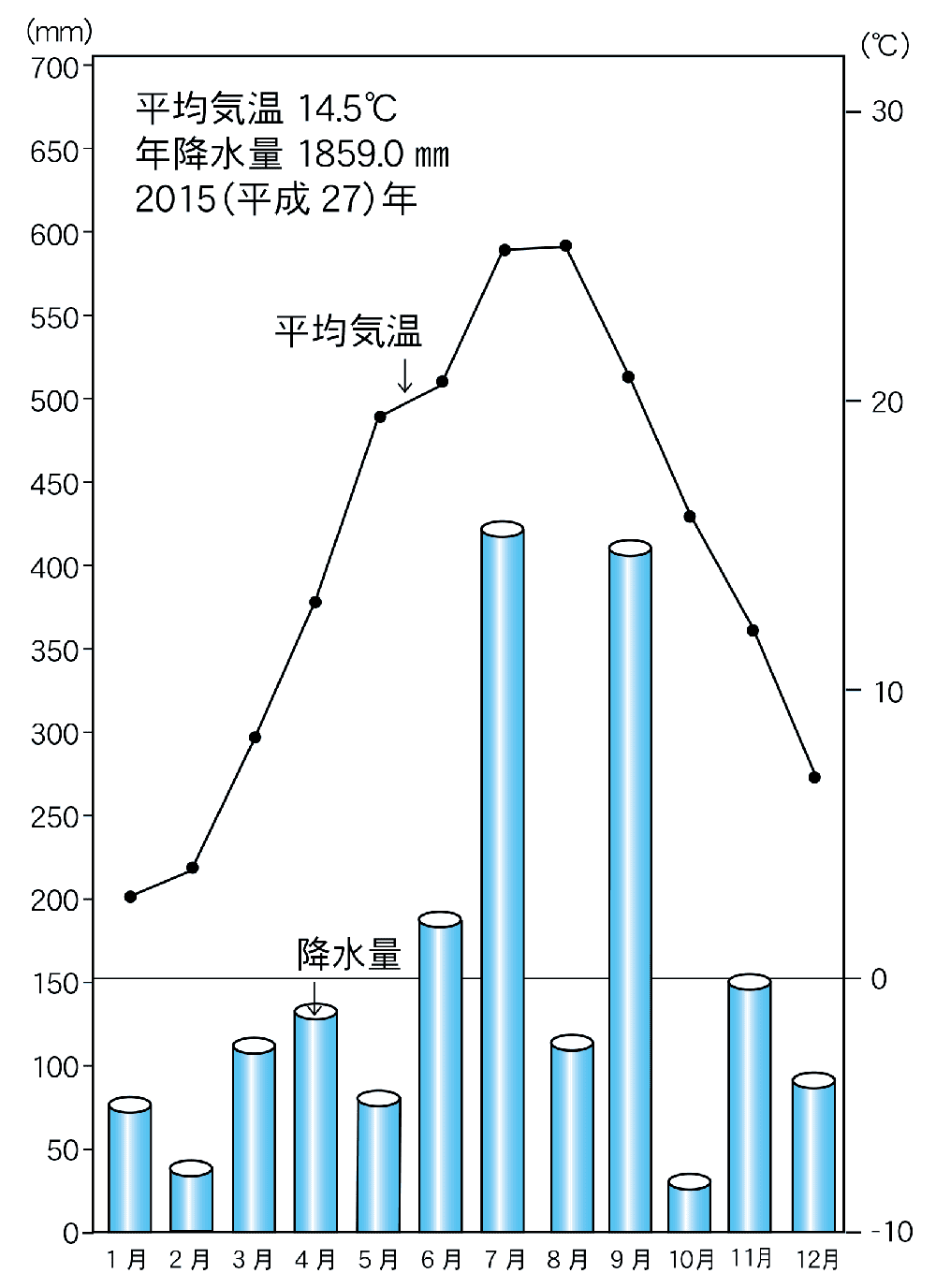 相模原地域の気候を示すグラフを見てみましょう。夏に雨が多く,あたたかであることがわかります。したがって,典型的な太平洋岸気候であるといえます。