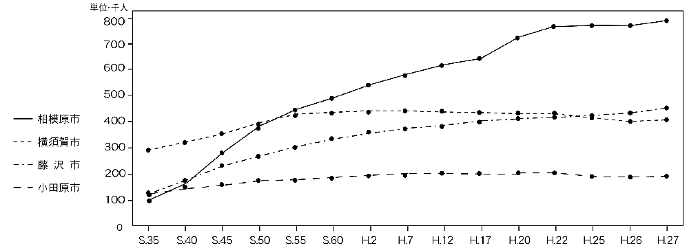 市制施行当時(1954(昭和29)年)は8万人たらずだった相模原の人口は,2007(平成19)年には70 万人を超え,県下では,横浜市・川崎市についで3番目,全国でも18 番目(2015(平成27)年10 月現在)に人口の多い都市になりました。1954 年から50 年ほどで,人口が8倍以上と急増をとげたのはなぜでしょう。その理由を考えてみましょう。