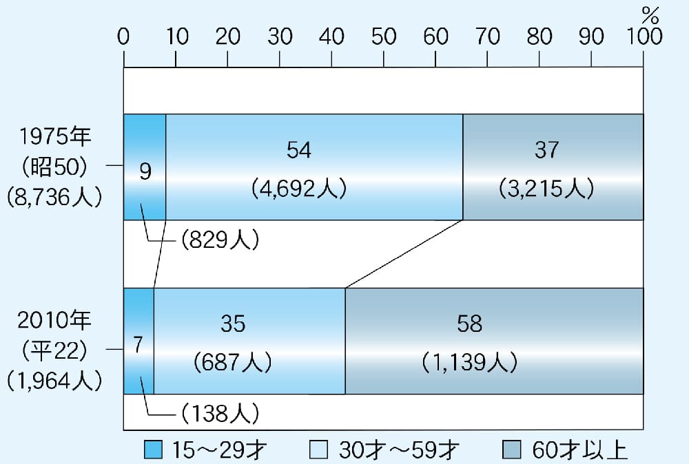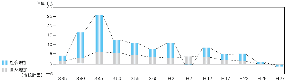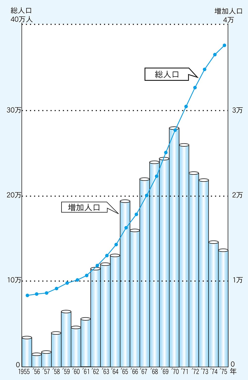 人口が著しく増加したのは,1960(昭和35)〜70(昭和45)年代で,そのほとんどが社会増加によるものです。この時期は,わが国の経済が高度成長をとげ,工業化が進むとともに,東京や大阪などの大都市圏が拡大されていったころです。