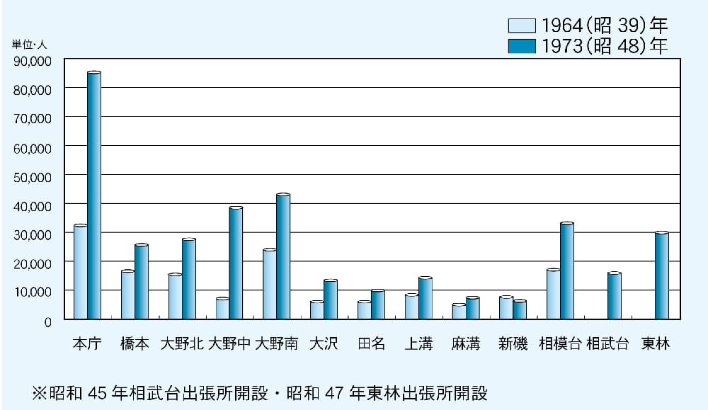 1964 年と1973 年の出張所別人口比較(各年10 月1 日現在)