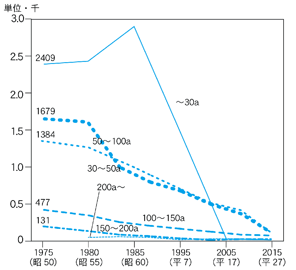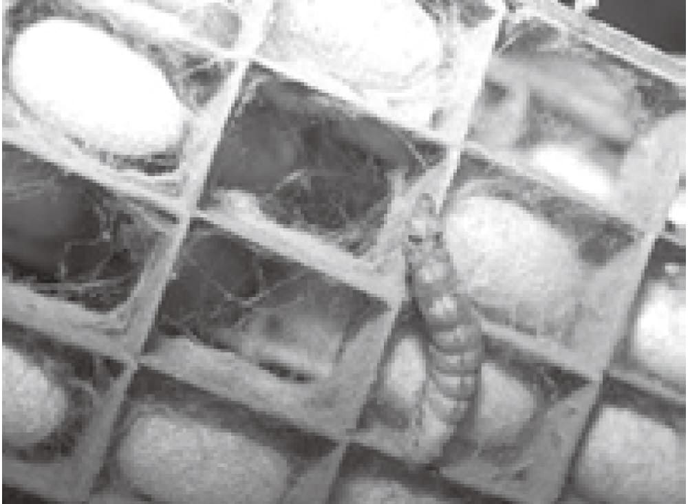 近代以降の養蚕は,農家が卵(養蚕の世界ではタネと呼びます)から育てるわけではありません。優良な品種を安定して供給するため,孵化後しばらくは一括して営農センターなどが人工飼料を使って飼育し,2回脱皮をして3齢幼虫になったところで各農家へ配布するのです。そのため,1軒だけで養蚕を続けることはできません。このように,養蚕業は設備や桑園の管理など大変な仕事が多くあります。また,会社や工場に務める人が多くなり,後継者がいないことも減少を加速させました。さらに,日本国内の絹の需要も減り,安い外国産の製品との競争も強いられるようになりました。そういった様々な厳しい状況があり,平成12年時点で,相模原市内の養蚕農家の数は4軒にまで減ってしまいました。(県内の養蚕農家は12軒。うち4軒が相模原市内)
