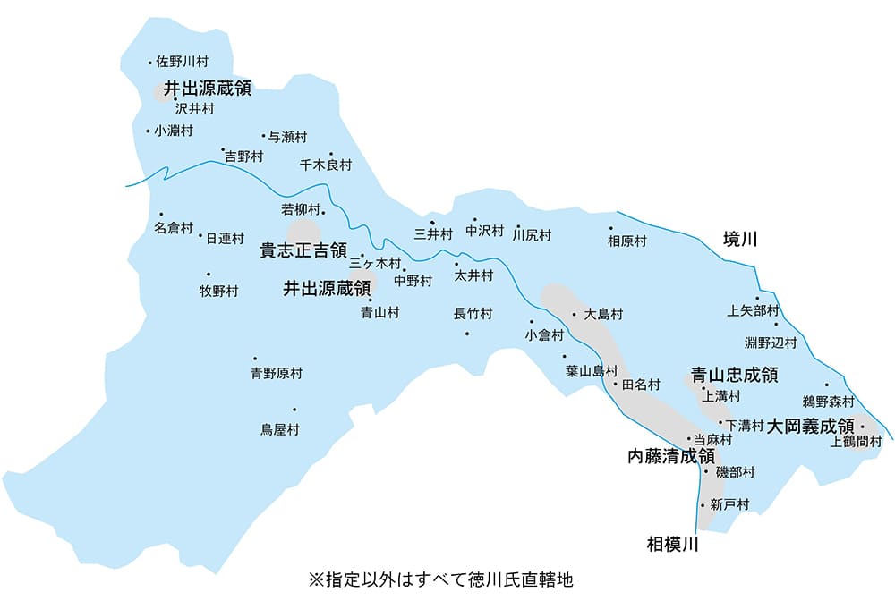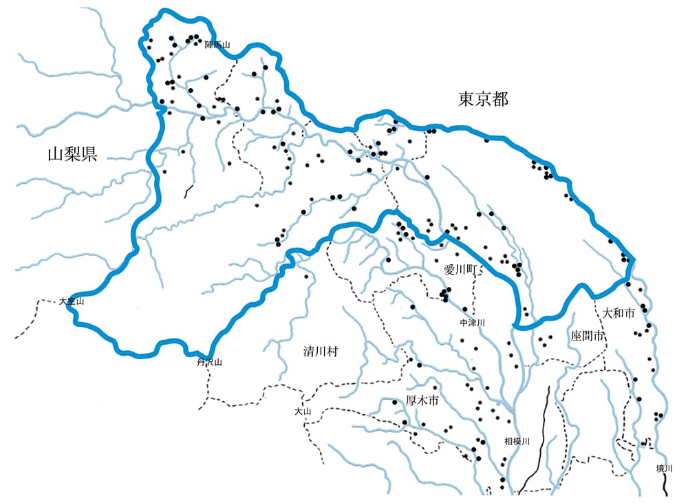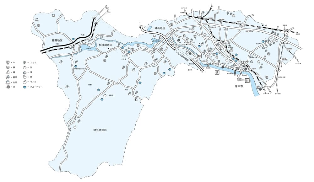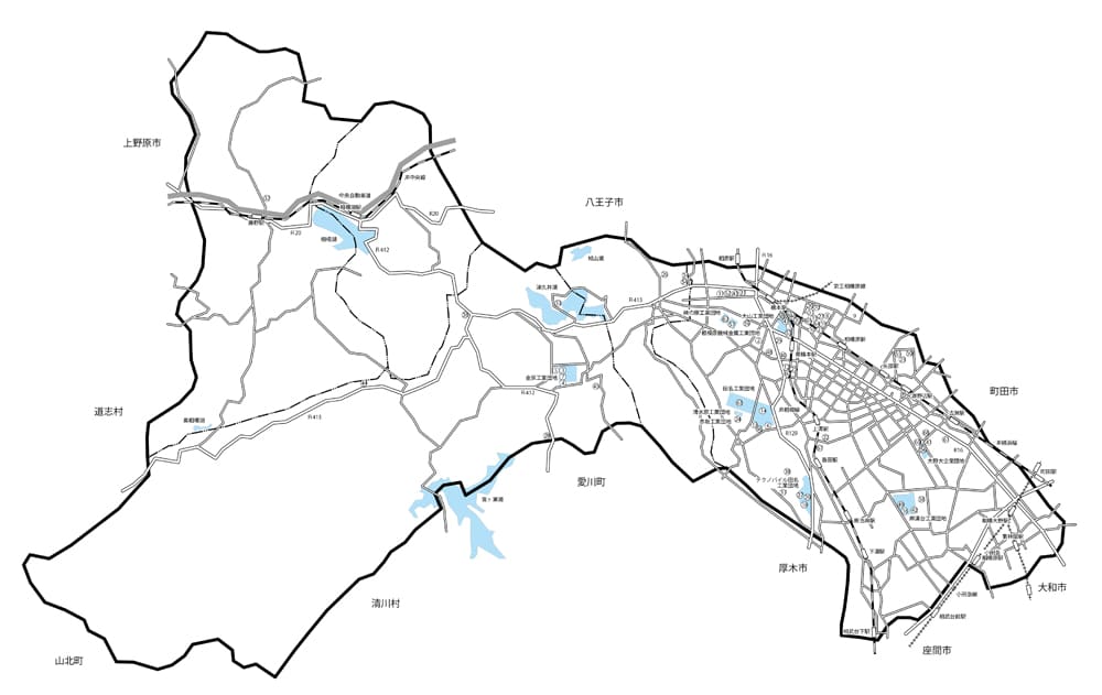 二つの山地の間を相模川が流れています。相模川や道志川などの大きな川の近くにいくつかの集落が分布しています。