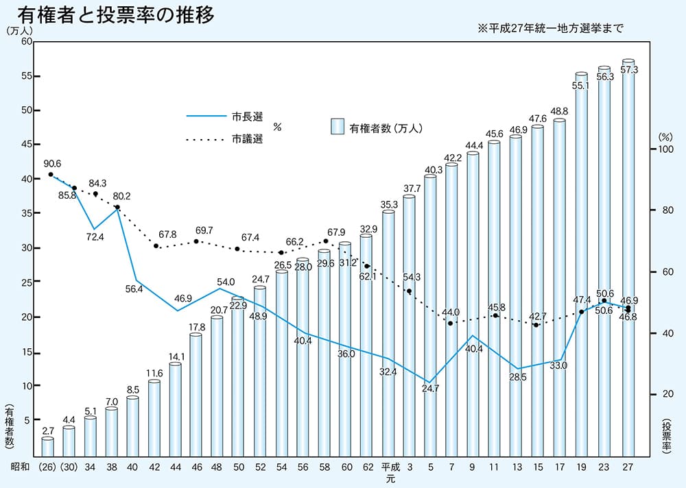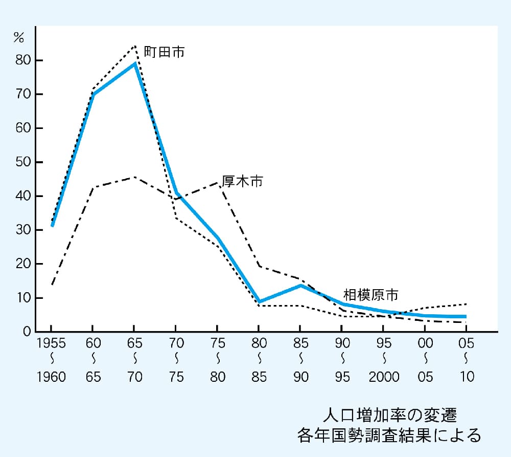 相模原でも,1955(昭和30)年に工場誘致条例(こうじょうゆうちじょうれい)が施行され,多くの会社や工場が市内に進出してきました。また,1958(昭和33)年には首都圏整備法の市街地開発区域の第1号指定をうけ,それにともなって,相模原にも都市化の波が押し寄せてきました。このとき,職場や宅地を求めて,県外や県内から多くの人が相模原に移り住んできました。さらに2007(平成19)年には,津久井地域と合併し,人口が増加しました。