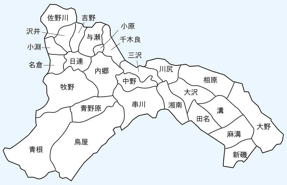 相模小原市の位置県北の相模原と県内の市町村(津久井地域の名称は合併前のもの)