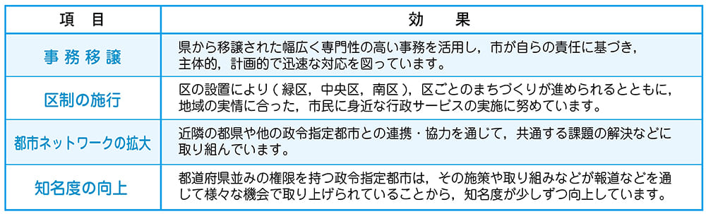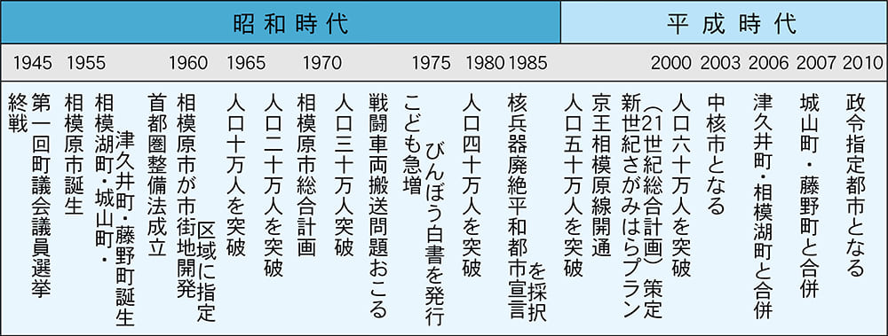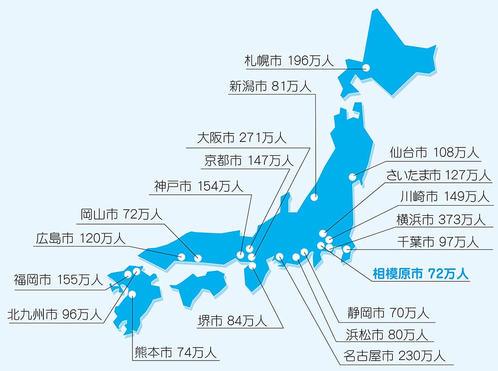 首都圏の拡大とともに,東京や横浜のベッドタウンとして,また,内陸工業地域として,相模原市は,その重要性を高めてきたといえます。2003(平成15)年度には政令指定都市に次ぐ権限のある中核市に移行し,2006(平成18)年3月と2007(平成19)年3月の津久井地域との合併を経て,2010(平成22)年度に政令指定都市へ移行しました。今後はさらに都市機能を充実させ,自然環境と共生した都市へと発展しようとしています。