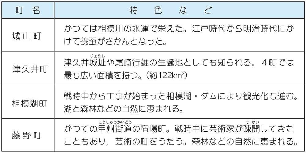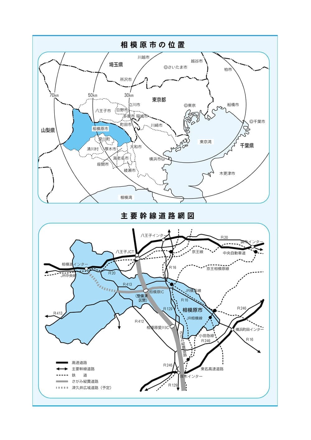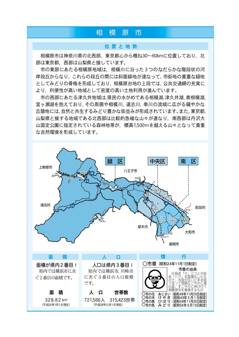 私たちの郷土「相模原」は,神奈川県の北部にあって,丹沢山地や富士山を望み,橋本・相模原・相模大野駅周辺などの多様な都市機能をもった相模原地域と2006(平成18)年~2007(平成19)年に合併した相模湖・津久井湖・宮ヶ瀬湖などの水源を含む豊かな自然を有する津久井地域からなっています。