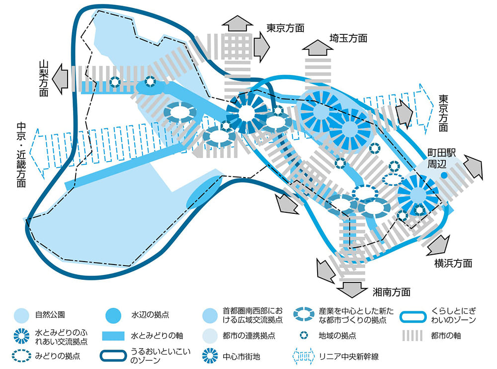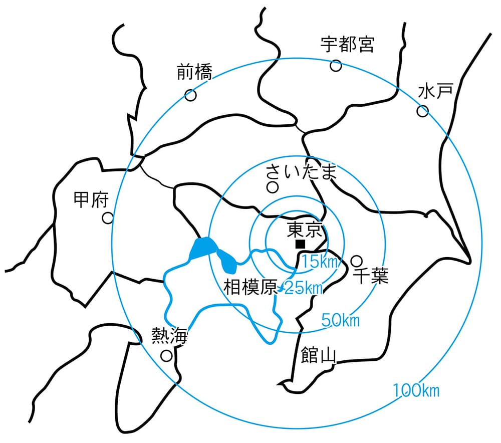 また,相模原市は東京都心からおよそ33〜65㎞のところにあり,首都圏内に位置しています。首都圏は政治・経済・文化などあらゆる都市機能が集中した,日本最大の都市圏です。そのなかで,相模原市は東京の近郊都市として,急速に都市化が進み発展してきました。