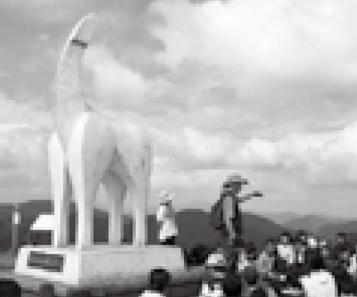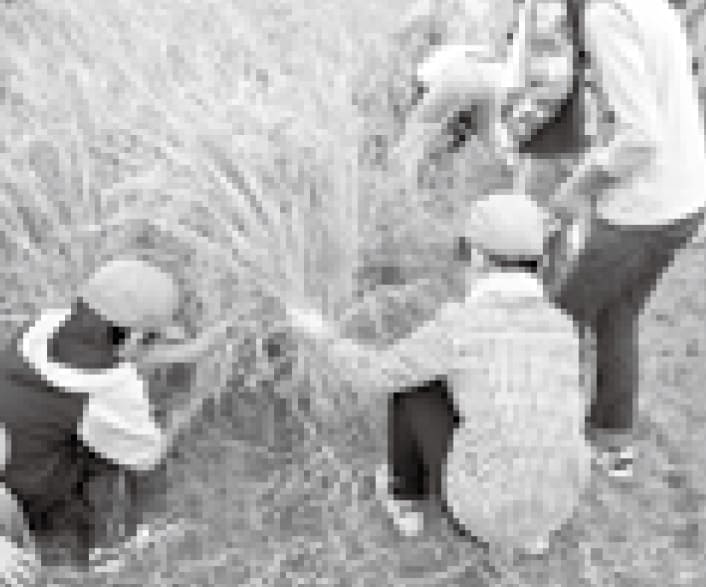 1882(明治15)年,そのスタートとしての最初の基線が相模野に決められました。基線の北端が麻溝村に,南端が座間村に設置されました。当時の測量では,今のようにレーザー光源を利用するのではなく,測竿といわれるスチール製のものさしが使われました。両端の基端点の間は見通しがきくように,木や草を刈って幅4メートルほどの道を作って測量が行われました。このようにして決められた相模野基線をもとにして,初めて2万分の1の地形図が作られ,後に5万分の1や2万5千分の1の地形図へと発展していきました。